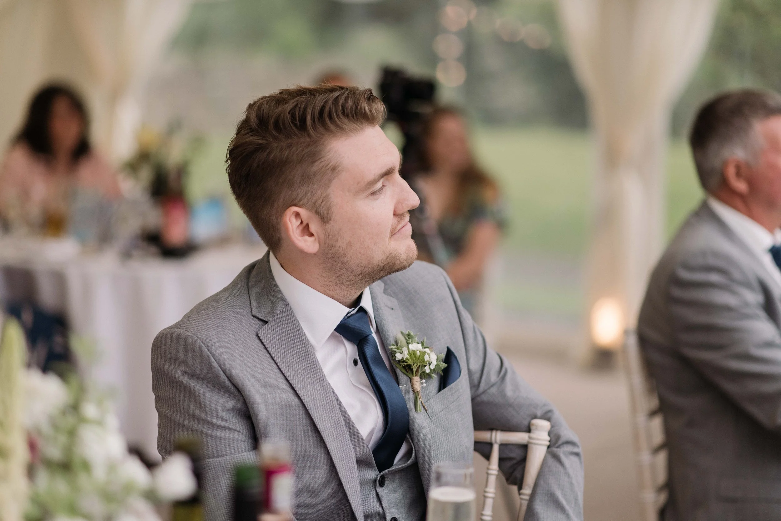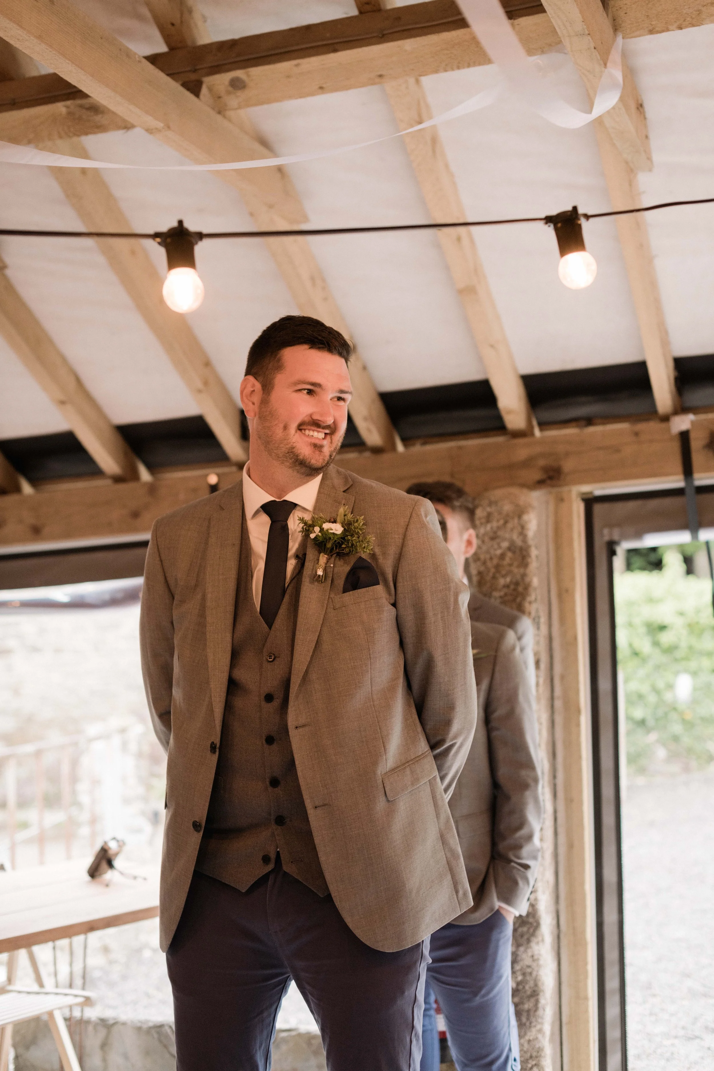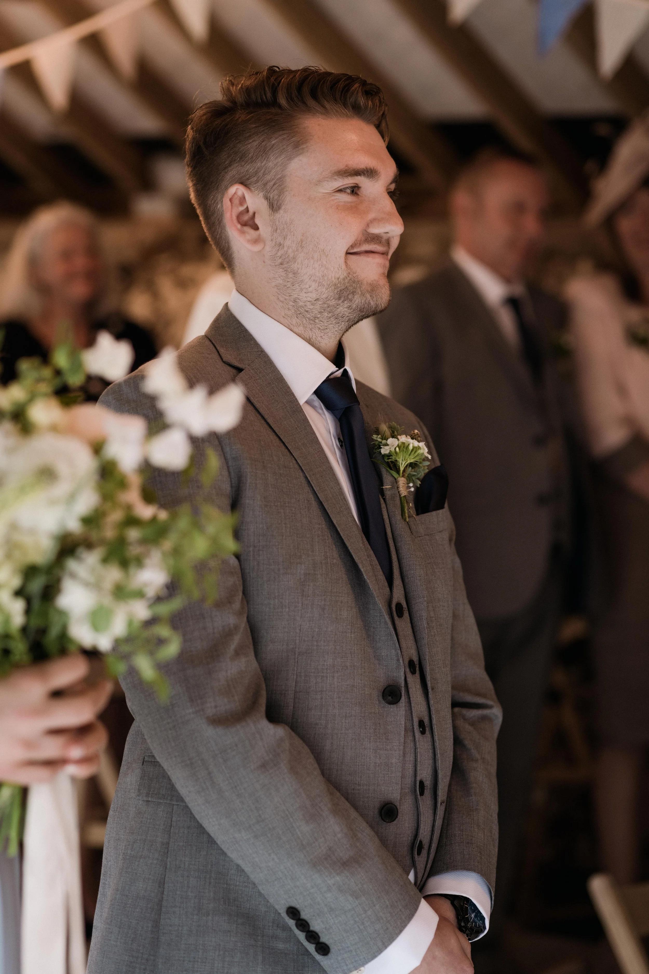 Rather than a traditional suit, Ryan the groom and his groomsmen opted for a chinos & blazer waistcoat combo adding another shade of blue to the soft, dusky colour palette. It was such a pretty spring wedding with so many natural eco touches to the decorations with absolutely every decoration being homemade by the couple and their friends and family. It was a real DIY wedding.
