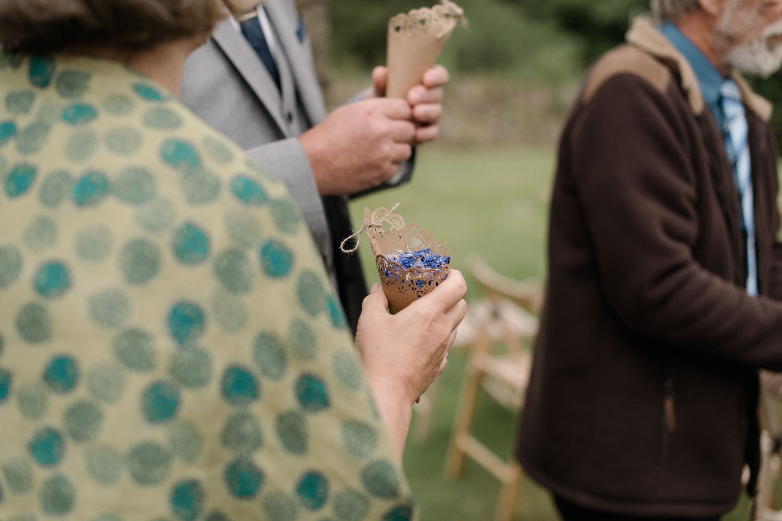 The original dry weather plan was to have the ceremony in the little pagoda overlooking the hills but a wave of drizzle came in sending everyone into the cosy, stone barns instead. Amber & Ryan were wed beneath the string bulbs but just as the ceremony finished, the cornish mizzle gave way and we were able to head out to the pagoda for their confetti train. In keeping with their wildflower theme, they opted for eco dried petal confetti which not only looks beautiful but is naturally biodegradable. We always advise our clients to use biodegradable confetti and you can even dry and make your own easily if you opt for petal confetti.