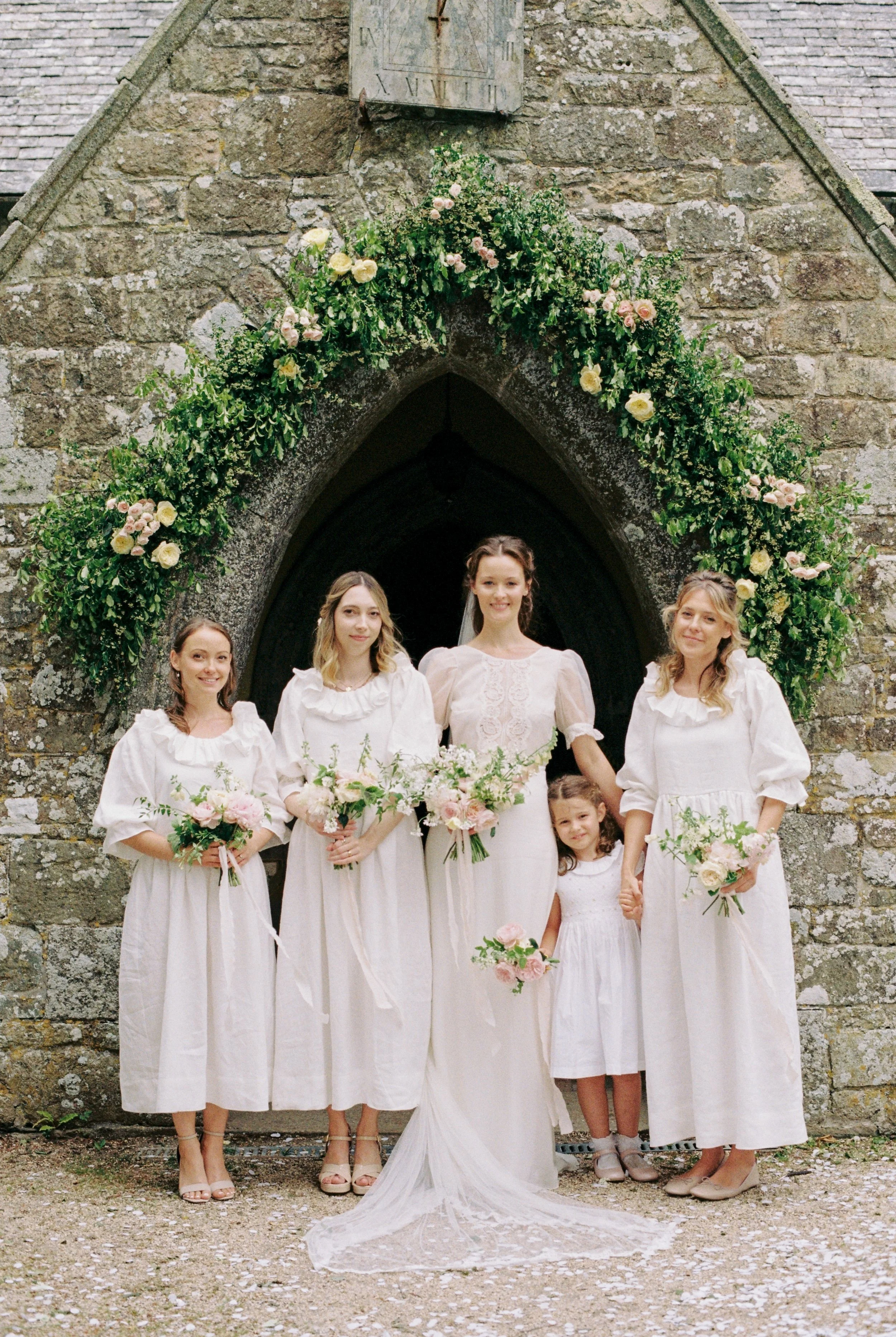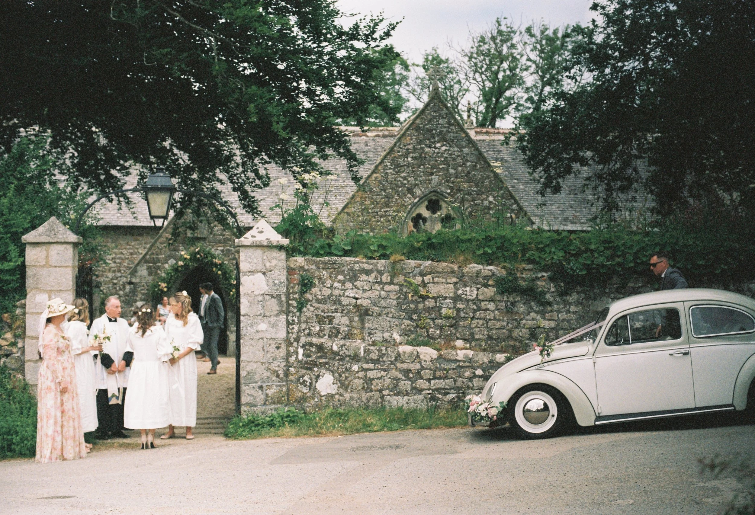 Georgie Harandon was on makeup duty, performing an exemplary job as always with Lauren Bramble managing the hair. A vintage VW carried them to the church where a string quartet played hymns for the congregation to sing along to. The beautiful little church at St Hilary was filled to the brim with delicious floral displays bringing the churchyard vibes inside.