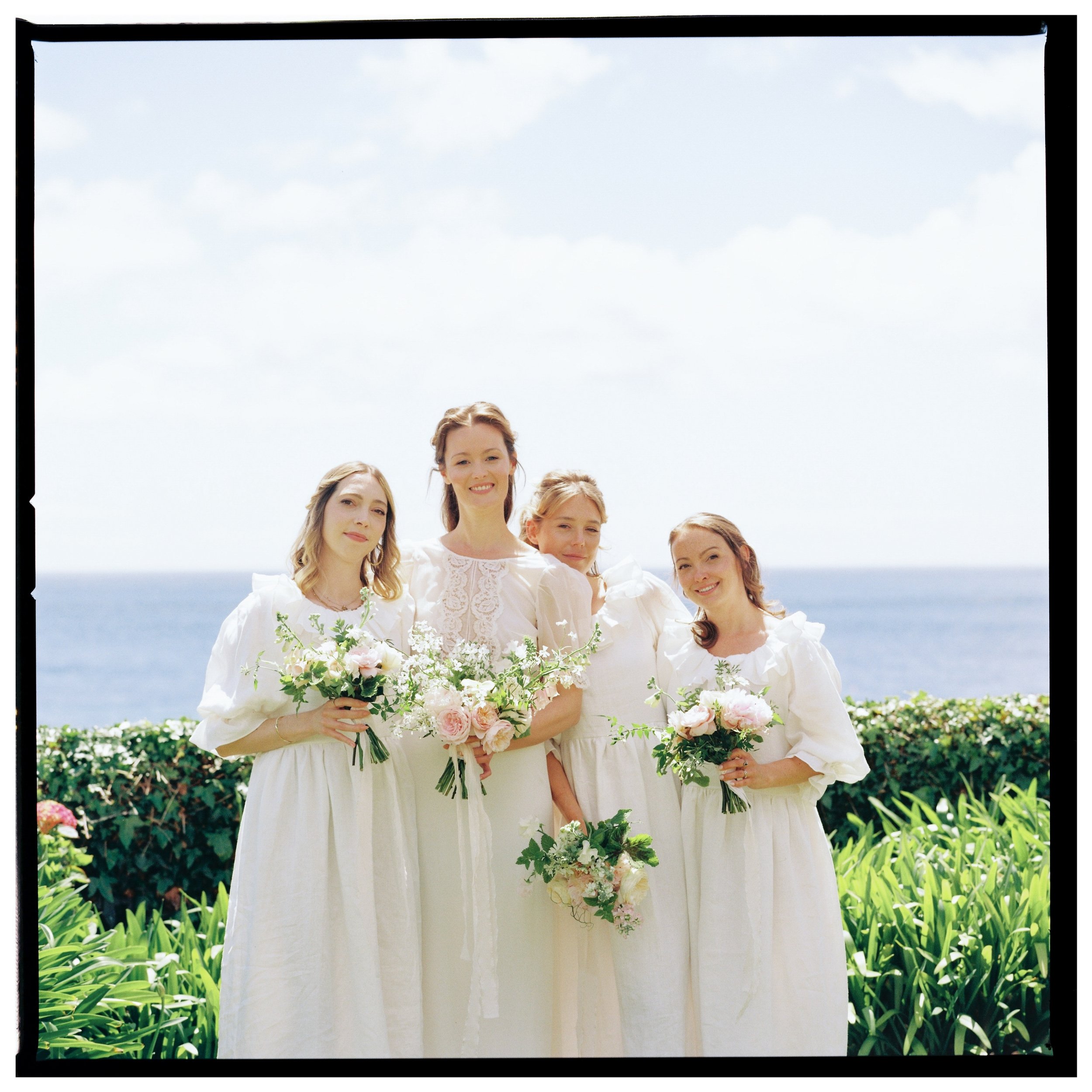 Porth en Alls is a well hidden estate tucked away on the Cornish south coast by Prussia Cove. A famed smuggling cove, I wish I could tell you the history of Porth en Alls but alas it is a mystery to me. One thing I can tell you, is that the old house is riddled with charm and transports you back to a time long ago. A time long ago was definitely the theme for Charlotteβs wedding. A true vintage beauty, Charlotte loves all things of yesteryear and a talented film photographer herself, it was always plain from the get-go that she would have her day documented entirely on analogue. Her french lace gown by Laure de Sagazan was sourced via the Mews Bridal in London and it had the prettiest voile puff sleeves in a soft white. Bunting decorated the cheerful walled gardens that overlooked the ocean, pastel tablescapes teeming with blooms locally grown by Katie of Wild Rose Cornwall were overlooked by the foxgloves and sea beets that grew wild in the walls and cobbled paving stones led down to a private cove by the aquamarine sea. Boats sailed gently past every know and then and an acoustic band serenaded the guests as they milled among the sea pinks, dined on nibbles from Flora New Yard and watched the seabirds sunning themselves on the rocky outcrops.