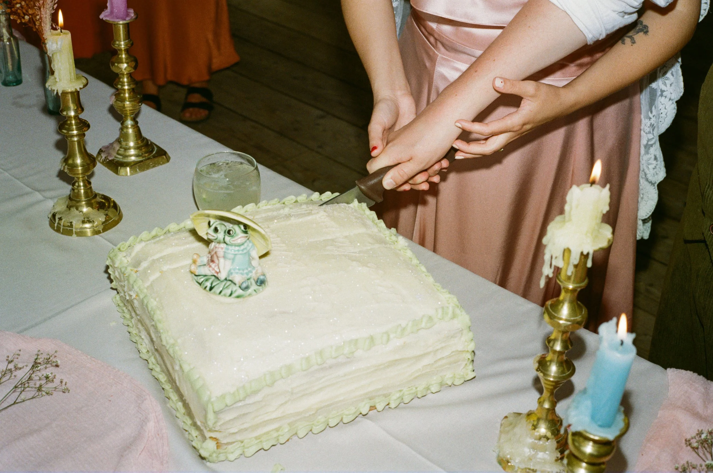 The bride made her own cake with a mix she bought at Costco and decorated it with edible glitter and these adorable ceramic froggy lovers. Honestly one of the most delicious cakes Iβve ever eaten. Iβm ready for all the cake makers to come for meβ¦