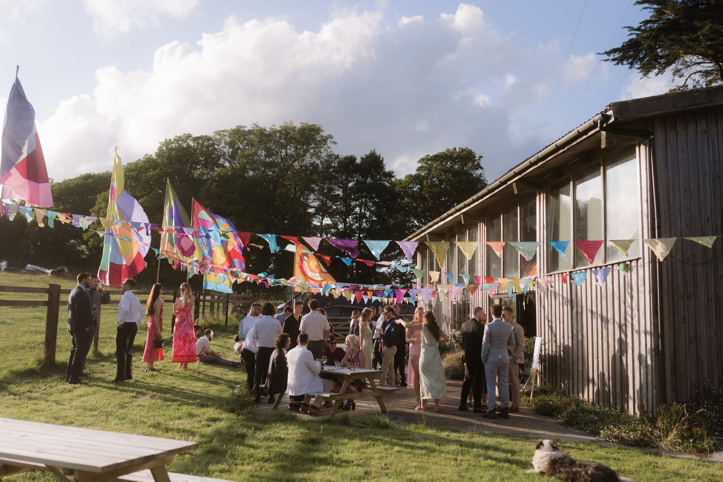 It was a bright and hot summerβs day in the far reaches of South Cornwallβs Lizard peninsula. The exact sort of day you think of when you dream of languid July afternoons, butterflies flitting about the wildflowers and long grass gently wafting in the breeze. Alice & Alfieβs friends and families had been busy at work, setting up the venue to create an incredible backdrop for their eclectic wedding. One of the many, many things we loved about Alice & Alfieβs wedding was that there was no βthemeβ or Pinterest. It was a perfect example of just doing what you love for your wedding day and blending elements of all of your favourite things. They had friends style the tables for them and create beautiful place names & stationary as well as another friend from Blowth flowers set up all the bright & joyful florals. Another family friend was a festival flag draper (is that the profession? Forgive us if thereβs a better word for it!) but they were responsible for hanging the zillions of strings of silk bunting that really set the vibe and created such a vibrant scene. Especially outside in the courtyard where all the rainbow flags billowing in the late afternoon breeze felt so surreal and reminiscent of a music festival. Alice & Alfie had so many friends and family involved on pulling together their wedding that it was a real community effort, it made the whole day and just showed what you can achieve without an enormous budget if you let people share their talents.