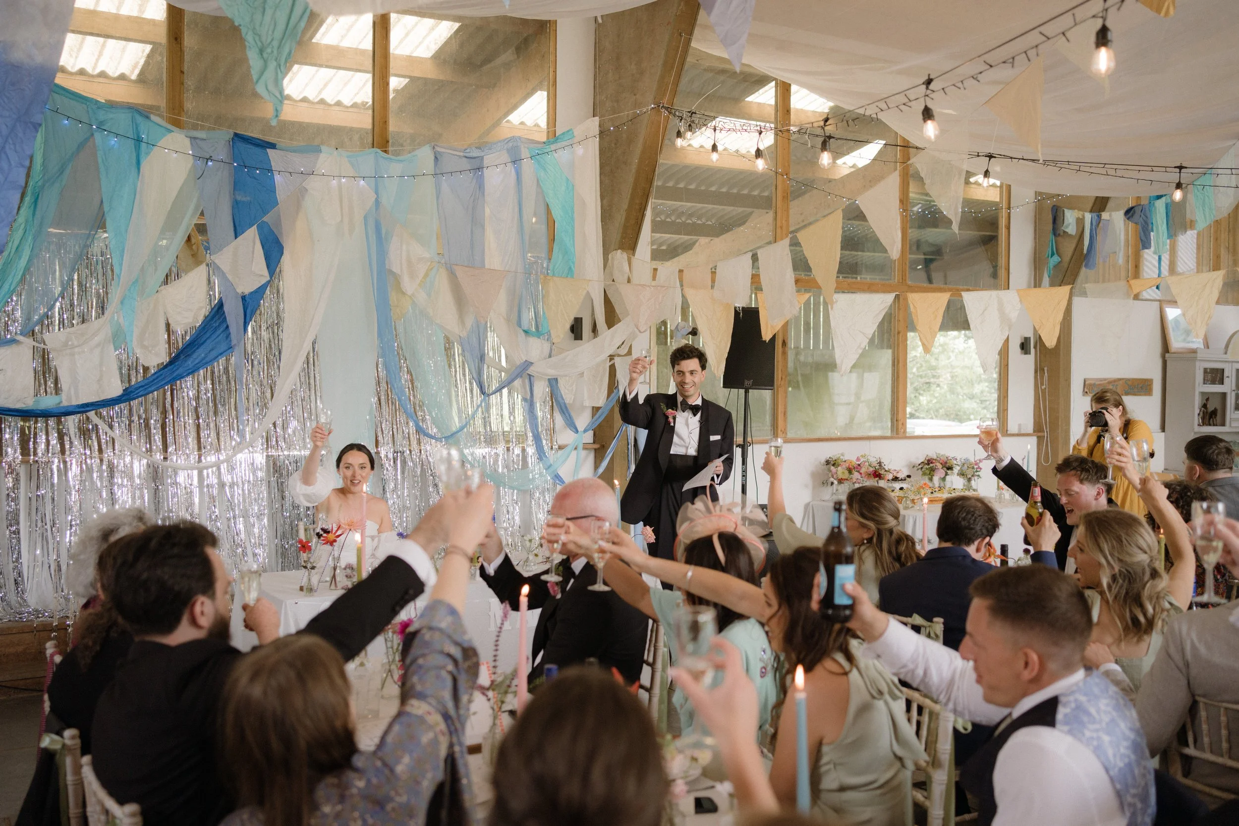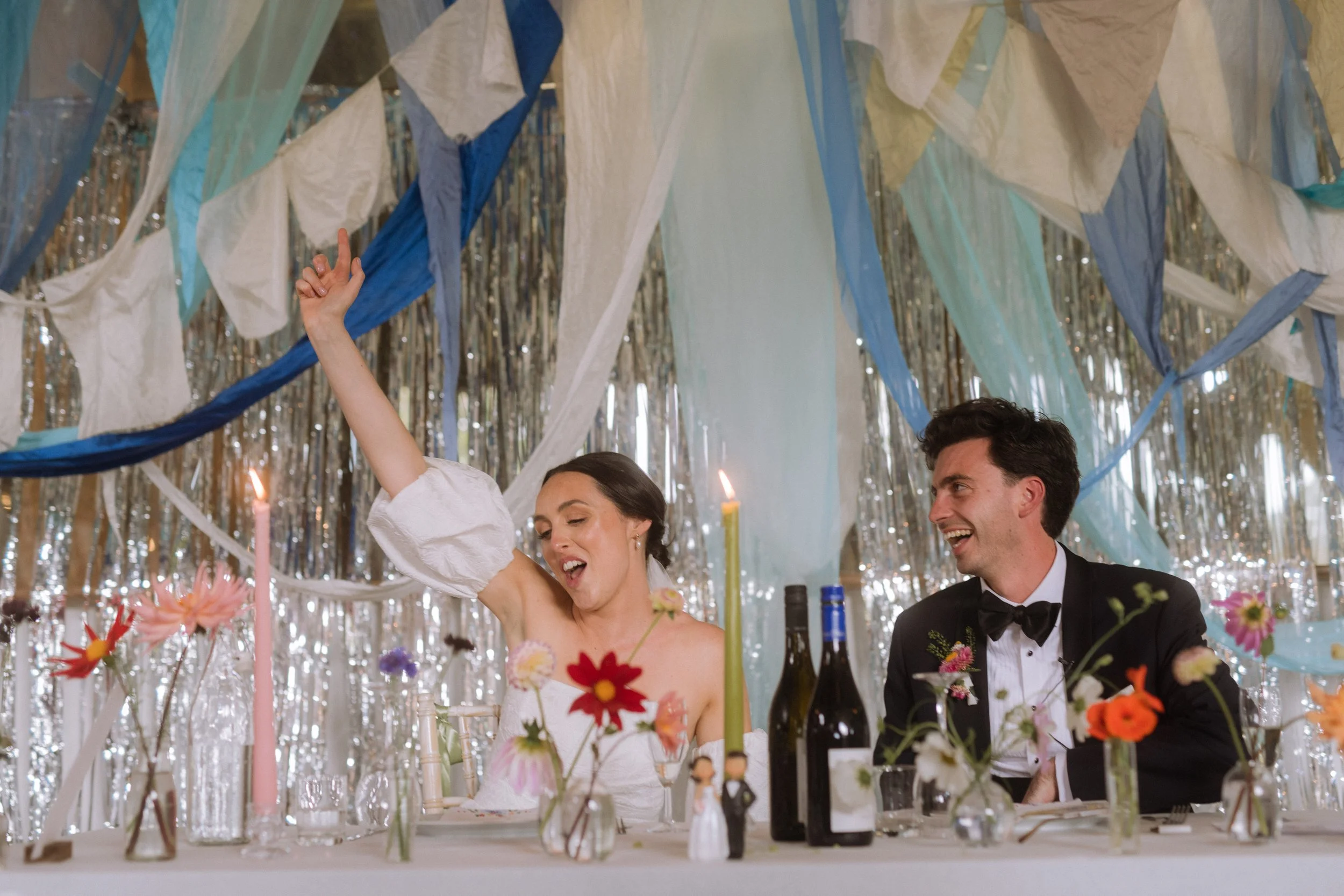 Their kind friends at Myrtle and Oak teamed up with Blowth flowers to style the tables. With the light shining through the big windows and a giant colourful traybake cake decorated in flowers with silk flags draped along every inch of the venue created the most magical and whimsical scenes for their celebrations. The Groom set up a proper DJ booth and with the glittery retro tassle backdrop there was some real 80βs prom vibes going on.