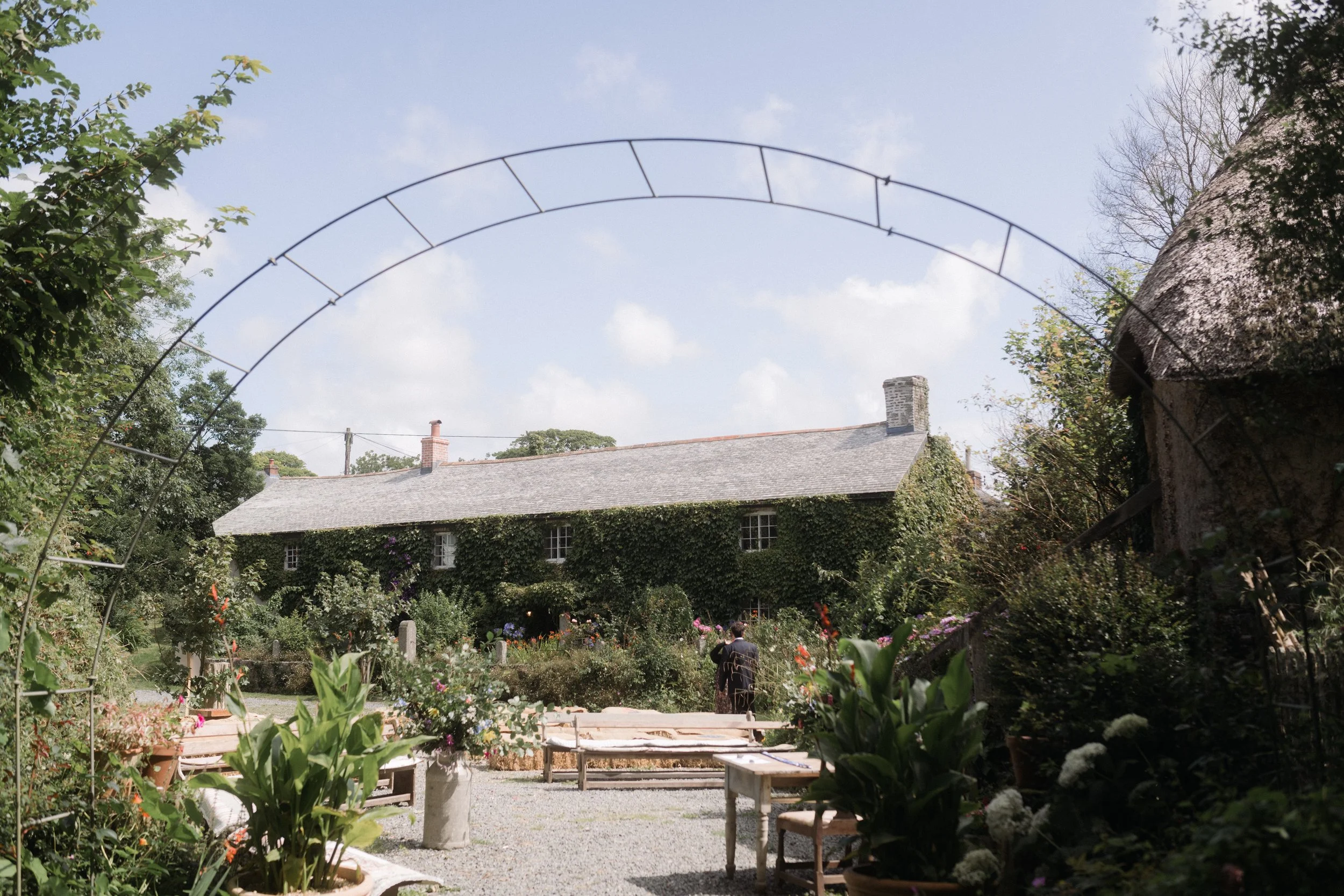 The ceremony took place in the sunny courtyard between the little Cob barn and the old farmhouse.
