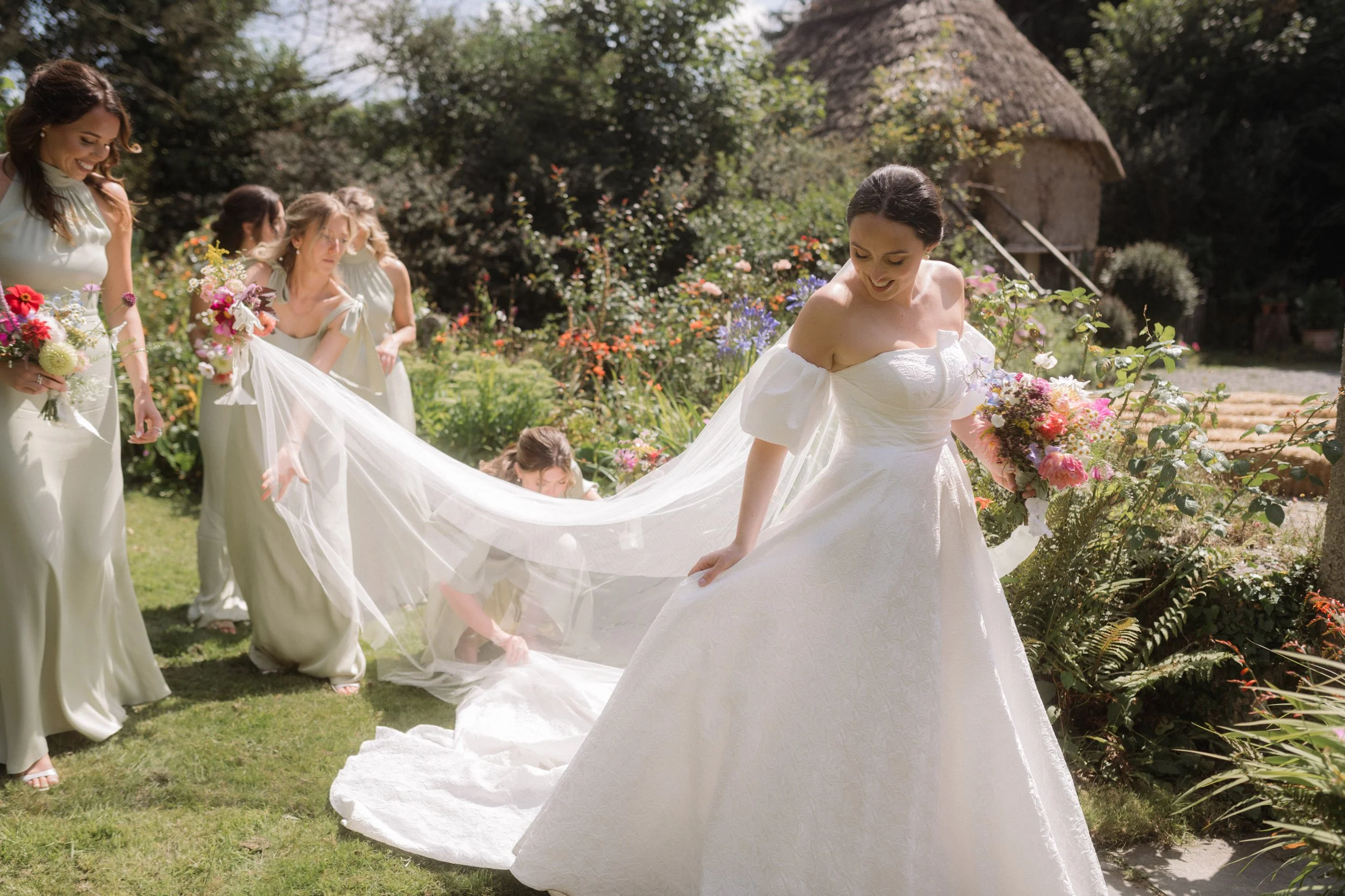 Alice chose a beautiful textured ballgown with puff sleeves that was like a modern Cinderella which blended beautifully with the fairytale landscape of the wedding venue.