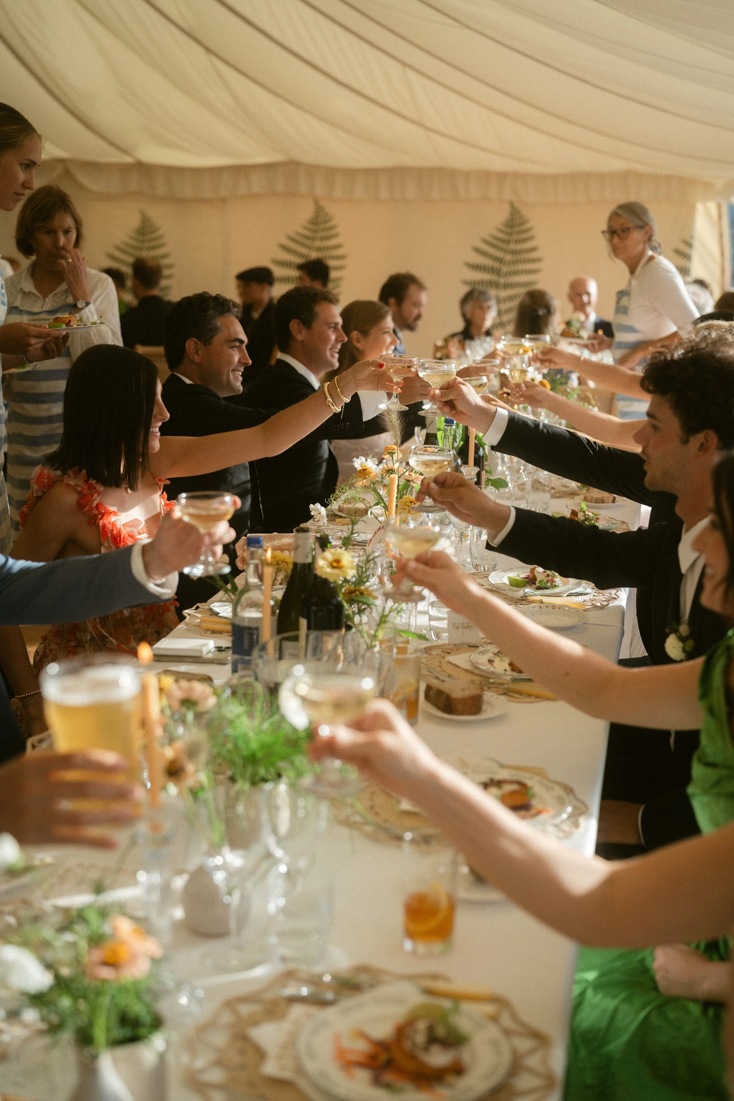 The marquee interior was so dreamy - despite the rain outside, the pale golds in the colour scheme, summery french rattan furniture and floaty floral installations made it feel like the height of summer inside the marquee for the champagne and oysters reception. Hazel and her team from Out of the Ordinary weddings brought the vision and details together to perfection along with the dream team florists Emily & Becca.